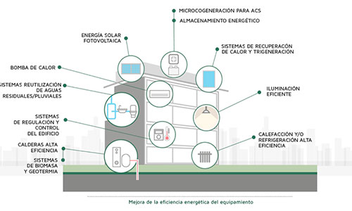La “activación” del capital ecológico de los edificios comporta actuaciones en cuatro dimensiones: la reducción de la demanda energética del inmueble; una generación más eficiente de confort, utilidades e iluminación; el aprovechamiento de la capacidad de autogeneración del propio emplazamiento del edificio; y, finalmente, un uso más racional e inteligente del consumo energético, parámetro muy dependiente en la actualidad del comportamiento humano, que evolucionará hacia una mayor objetividad y control en los próximos años con la implantación de tecnologías inteligentes y el internet de las cosas.