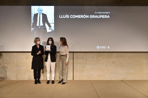 La Medalla de Oro de la Arquitectura es el máximo galardón que otorga el CSCAE. Este reconoce, de forma pública y notoria, el esfuerzo de personas e instituciones por ensalzar y ennoblecer el quehacer arquitectónico durante su trayectoria profesional. La ministra de Transportes, Movilidad y Agenda Urbana, Raquel Sánchez Jiménez, hizo entrega del galardón a la viuda del presidente Lluís Comerón, Laura López Giró.