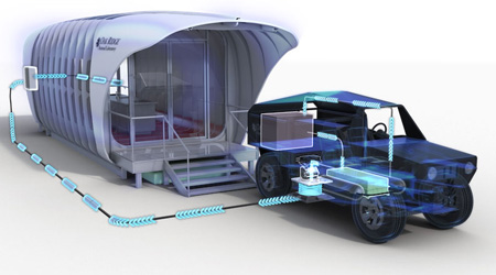 Con AMIE se ha conseguido que un edificio y un vehículo -ambos de fabricación 3D- estén conectados y se alimenten mutuamente. La construcción piloto de unos 64 m2 lleva incorporada paneles fotovoltaicos flexibles en el techo, que cubren las necesidades energéticas del hábitat y cargan tanto la batería de la casa como la batería del vehículo híbrido impulsado por electricidad o gas natural. Conjuntamente ambas unidades forman un sistema energético integrado. La energía puede fluir en cualquier dirección entre el vehículo y el edificio a través de una tecnología inalámbrica desarrollada por el laboratorio. Así, el generador de gas desarrollado por DOE e instalado dentro del vehículo sirve como complemento energético de la vivienda, cuando el sol no brilla. Por otra parte el coche se alimenta de la energía sobrante solar fotovoltaica cuando está estacionado. AMIE demuestra que el uso de la tecnología de energía inalámbrica y bidireccional y los materiales de alto rendimiento permiten lograr la independencia de la red eléctrica en los momentos de máxima demanda, a la vez que abren el camino a edificiaciones desconectadas de la red eléctrica.