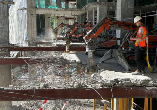 Los robots de demolición son herramientas muy versátiles, equipados con distintos accesorios que permiten picar, morder hormigón y también cortar el hierro de las estructuras armadas. En concreto en esta obra hemos usado los martillos de gran potencia y la cizalla de corte. El uso de la cizalla no solo se tradujo en un aumento de la eficiencia, sino que también contribuyó significativamente a la reducción de la contaminación ambiental y a la eliminación del riesgo de incendio asociado con métodos más tradicionales como el oxicorte.