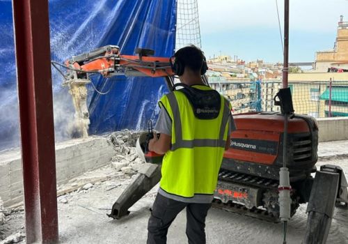 Al ser un edificio de mucha altura se debía trabajar con cuidado para evitar sobrecargar las plantas en exceso. Es por ello que decidí que la mejor manera y la más segura para realizar los trabajos era con los robots de demolición de Husqvarna, que son máquinas de peso sustancialmente inferior a las máquinas giratorias tradicionales, que se les puedan asemejar por potencia, pero tienen un tamaño mucho más reducido, y proporcionan la solución perfecta para maniobrar con destreza y trabajar en espacios mucho más estrechos y pequeños.