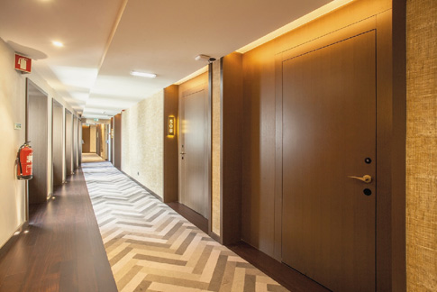 En muchos proyectos arquitectónicos, además de la resistencia al fuego, es fundamental integrar propiedades acústicas en las puertas y los cercos. Las soluciones cortafuego y acústicas responden a esta necesidad combinando tecnologías que impiden la transmisión del sonido sin comprometer la seguridad. Considere el nivel de insonorización que requiere cada espacio. Las puertas acústicas se clasifican en decibelios (dB), y la elección dependerá del nivel de ruido que quiere bloquear. Modelos como el Portaro® EI30 AC45, que ofrece una resistencia al fuego hasta 30 minutos y un aislamiento acústico hasta 45 decibelios, son ideales para hoteles y oficinas, donde el confort acústico y la protección contra incendios deben coexistir. El diseño de estas puertas exige la incorporación de materiales acústicos y sistemas avanzados de sellado que impidan el paso de humo y ruido, garantizando así una experiencia más segura y confortable para los usuarios.