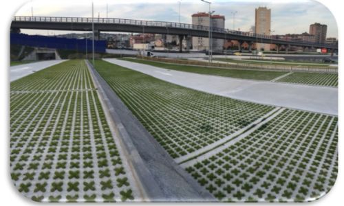 Además, esta tecnología permite su empleo no solamente en usos como pavimentos sino también como revestimiento permeable vegetal para la estabilización de taludes en parques y jardines, construcción de cauces, embalses y canales pluviales, y el fondo de humedales artificiales, aguantando perfectamente la presión hidrostática que en estos casos ejerce el agua.