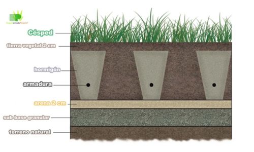 Con estos firmes la estabilidad del sistema no depende en ningún momento del césped al tratarse de un pavimento de hormigón continúo realizado “in situ” que nos permite perfectamente absorber las cargas de los vehículos y sus vibraciones. Teniendo la ventaja de poder utilizarse para la construcción de vías de acceso para vehículos de gran tonelaje como pueden ser bomberos, servicios de emergencia y camiones de mantenimiento, como para plataformas de aterrizaje y despegue de helicópteros ya que el sistema aguanta las cargas perfectamente.