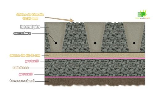 Figura 1 | Sección de pavimento de hormigón permeable (40%) con infiltración total, relleno de sustrato vegetal.