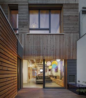En cambio, se ha diseñado en el patio una fachada ventilada de madera, con un aislamiento de lana de vidrio ignífugo. Se trata de una fachada con estructura de madera de alerce, que no requieren ningún tipo de tratamiento contra xilófagos y hongos, minimizando así el uso de perfiles metálicos. En la cara interior, se añade una cámara de instalaciones de 7 cm de espesor, esta vez, con un aislamiento de algodón reciclado, que resulta ser un material de gran potencial e interés debido al gran consumo de la industria textil.