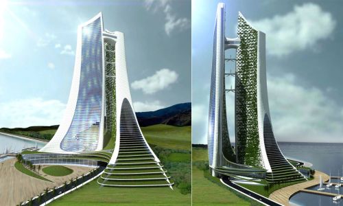 Vertical City es uno de los proyectos emblemáticos que aplican este sistema. Se trata de un edificio inteligente y “vivo” de más de 600 metros de altura para Arabia Saudí. Esta estructura laminar bioclimática controla el sol y optimiza la energía, formando la piel del edificio. El sistema interactúa entre el interior y el exterior con el entorno para proporcionar el mayor confort energético. Inspirado en las formas orgánicas de la naturaleza, se ha diseñado a través de estrategias de integración con su entorno, utilizando Corian® Solid Surface para la fachada.