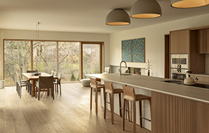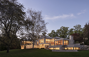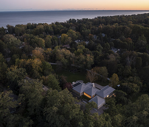 Esta amplia vivienda familiar se encuentra en la espesura de un bosque junto al lago Ontario, en Canadá. El arquitecto Omar Gandhu ha revestido el interior con paneles de roble y piedra caliza, haciéndose eco del paisaje y los materiales del entorno.