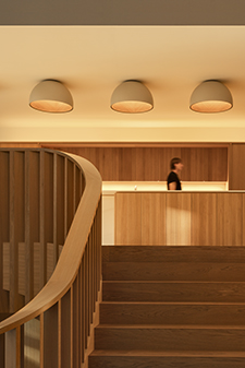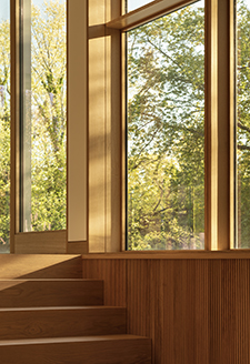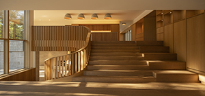 Otro ejemplo es la escalera; su barandilla curvada descansa sobre listones de madera angulares cuya disposición permite el paso de la luz durante todo el día sin interferir en la visión diáfana de todos los espacios. Además, los altos ventanales que reciben la luz parecen enmarcar las copas de los árboles y el cielo abierto.