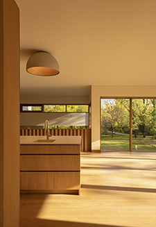 La presencia de la madera refleja la calidez de la luz natural y artificial en todos los espacios habitables de la casa, donde Duo juega un destacado papel. Esta colección diseñada por Ramos & Bassols para Vibia combina una carcasa metálica mate con un cálido revestimiento interior de roble. Alineadas en el techo de la cocina, cuatro luminarias en versión semiesférica iluminan la encimera, mientras que la versión cilíndrica hace lo propio en otros espacios de la vivienda.