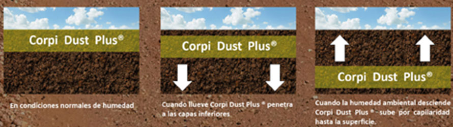 Corpi Dust Plus es un aditivo específicamente usado para tratar suelos con tendencia a provocar polvo, ya sea en vías sin pavimentar, aparcamientos, o cualquier superficie susceptible de levantar polvo. El aditivo funciona de tal manera que mantiene las partículas de polvo con una cierta humedad (absorbida de la humedad ambiente) que hace que las partículas tengan un mayor peso y por lo tanto no se levanten al paso de vehículos. Además no presenta ningún inconveniente cuando llueve, ya que el aditivo trabaja con la humedad ambiente, si la humedad es elevada el aditivo baja en profundidad, ya que no hace falta que actué, en cambio, cuando la humedad ambiental es más baja el aditivo sube manteniendo las partículas de polvo inamovibles.