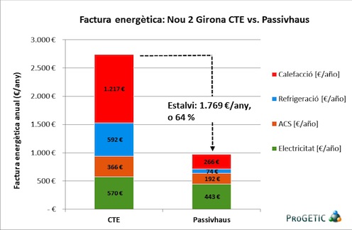 El Carrer Nou se ha certificado por Demandas, que se rige por los valores límites para la demanda de calefacción y refrigeración, la estanqueidad al aire del edificio y la demanda de energía primaria no renovable mostrados en la siguiente Tabla (para el clima de Girona):