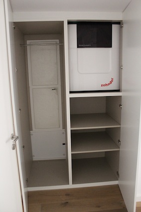 El sistema de ventilación es individual por cada apartamento, de doble flujo con recuperación de calor y humedad de alta eficiencia, certificado por el Instituto Passivhaus. Consta de una máquina de ventilación Zehnder ComfoAir Q 600 de 600 m3/h de caudal máximo y dos silenciadores, uno por cada circuito, impulsión y extracción. El sistema de distribución es en estrella, formado por conductos de polipropileno, conectados a bocas de impulsión/extracción instaladas en falso techo.