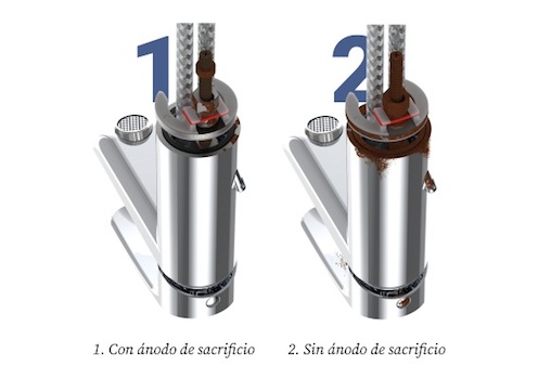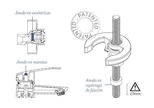 El ánodo es una pieza recubierta de zinc - magnesio, que se introduce en el interior del grifo para protegerlo del desgaste y la corrosión, tanto en su interior como en su exterior. Ramon Soler ha patentado este sistema anticorrosión y lo coloca en todas sus series de griferías y de conjuntos de ducha: tanto en los anclajes verticales como en los murales, asimismo sus manetas están también protegidas. Esta solución, supone un importante avance para la durabilidad de la grifería de Ramon Soler.