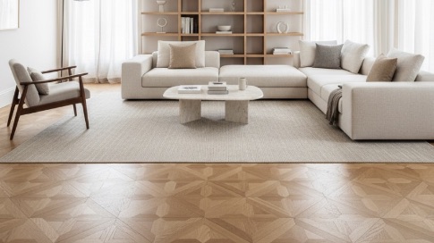 4. Combinación de materiales: La madera se atreve a mezclarse. La tendencia más chic será la integración de las piezas de madera con elementos de mármol, cerámica o metales (como latón o cobre) dentro del mismo patrón geométrico, especialmente en zonas de transición como entradas o pasillos.