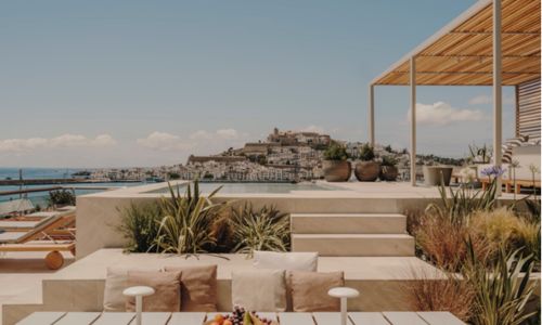 Buque insignia del hotel, este alojamiento configura uno de los rincones más especiales y sobresalientes gracias, entre otras cosas, a sus imponentes vistas al lugar más simbólico de la isla, la ciudadela amurallada de Dalt Vila.