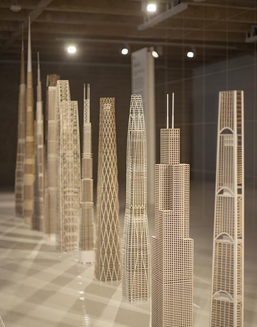 La muestra incluye una serie de maquetas estructurales a escala 1:500 destacando algunos de los revolucionarios proyectos de esta firma alrededor del mundo, como la sede de JTI en Ginebra, el edificio Exchange House en Londres y Hotel Arts de Barcelona. La muestra se completa con algunos de los proyectos más influyentes en la historia de SOM tales como el John Hancock Center (actualmente conocido como 875 North Michigan Avenue), Sears Towers (actualmente conocidas como Torre Willis) y el Burj Khalifa.