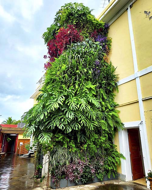 Uno de sus alumnos certificados ha llevado a cabo un jardín vertical con su metodología en esta isla francesa ubicada en pleno océano Índico. Este espacio natural ha sido creado en uno de los edificios del ayuntamiento de la ciudad de Saint Paul.