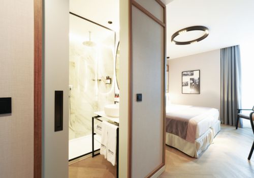 La estética luminosa del hotel se realza con el diseño de madera Dekordor® HD de Vicaima, personalizado para este proyecto, que reviste todas las puertas, añadiendo sofisticación y distinción. Los paneles de madera, siguiendo el diseño de las puertas, se integran armoniosamente en varias áreas, subrayando el compromiso de Vicaima con la creación de entornos equilibrados entre belleza y practicidad.