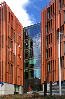 La residencia de estudiantes ofrece 150 apartamentos individuales, dos viviendas tuteladas y zonas comunes para los cerca de 250 estudiantes que viven en el campus. Los tonos cálidos e intensos de la paredes y los techos de tablas encoladas confieren una nota característica a la atmósfera interior del edificio y convierten a Gillies Hall en un acogedor hogar temporal. Esta construcción de madera maciza erigida sobre un zócalo de hormigón se construyó en tan solo once semanas. En las cinco plantas superiores se ha dispuesto un llamativo revestimiento exterior compuesto por láminas de chapa verticales de color cobrizo. Delante de las ventanas, las láminas están colocadas en un ángulo de 90 grados y, de este modo, proyectan un juego animado de sombras en la envolvente del edificio.