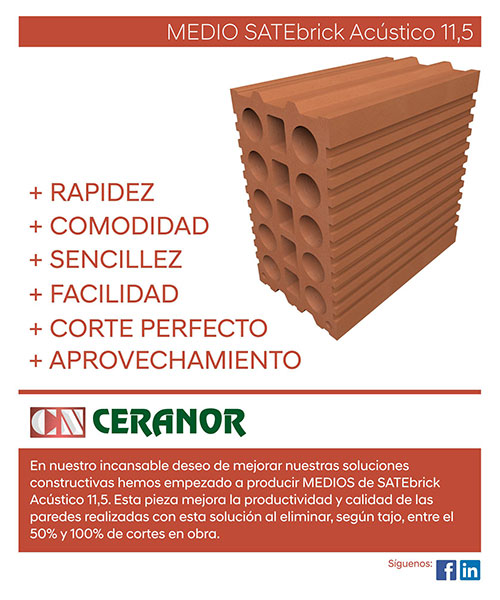 Ceranor amplía la oferta de producto con una nueva pieza especial de la familia SATEbrick. Se trata del nuevo MEDIO SATEbrick Acústico de 11,5 que permite una mejora de la productividad y calidad de las paredes realizadas con esta solución al eliminar, según tajo, entre el 50% y el 100% de cortes en obra.