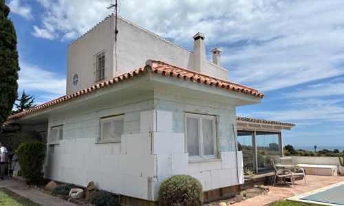 La vivienda presentaba una fachada muy deteriorada, con soportes envejecidos y un riesgo evidente de aparición de fisuras, consecuencia de la antigüedad de los materiales y de las condiciones climáticas de la Costa del Sol. El cliente buscaba una intervención global que asegurara la eficiencia energética, reforzara la estabilidad de los paramentos y proporcionara un acabado uniforme y resistente. Además, previamente se habían sustituido las ventanas, lo que permitió completar el proyecto con una solución integral que garantizase el máximo rendimiento del conjunto.