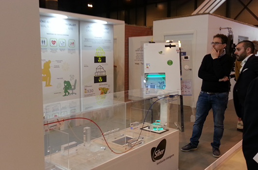 Otro de los colaboradores de SIMAlab fue Siber, empresa especializada en sistemas de ventilación inteligente. Ellos mostraron en una maqueta cómo un equipo de ventilación mecánica controlada de doble flujo se encarga de expulsar el aire viciado en una vivienda cerrada de forma hermética. Estos sistemas cada vez más en uso en los Edificios Energía Casi Nula (EECN) filtran también el aire que llega del exterior, factor importante especialmente en las ciudades con un alto grado de contaminación. Para demostrar los beneficios de estos sistemas, Siber expuso en su stand un filtro usado totalmente ennegrecido después de pocas semanas de uso en la ciudad, una muestra que no pedía más explicaciones.