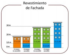 La clase de reacción al fuego de los sistemas constructivos de fachada que ocupen más del 10% de su superficie será, en función de la altura total de la fachada: