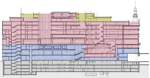 Para llevar a cabo la conservación de las fachadas de todos los edificios y de la primera crujía de dos de ellos, ha sido necesario disponer de una compleja estructura provisional para la estabilización y el apeo de las fachadas, durante la demolición del interior de la edificación y la ejecución de la estructura definitiva. Una vez retirados cuidadosamente los elementos históricos a restaurar, y demolido el resto de la edificación, se inicia la ejecución de la obra mediante un proceso “ascendente-descendente”, que permite construir la estructura sobre rasante y la estructura bajo rasante en paralelo, lo que posibilita ganar tiempo y poder adelantar la ejecución de las plantas superiores, que van a requerir más tiempo y detalle por corresponder a las áreas públicas, pese a añadir complejidad a la ejecución y retrasar la obra de las plantas bajo rasante, que requieren menos tiempo por tratarse de áreas de apoyo y aparcamiento.