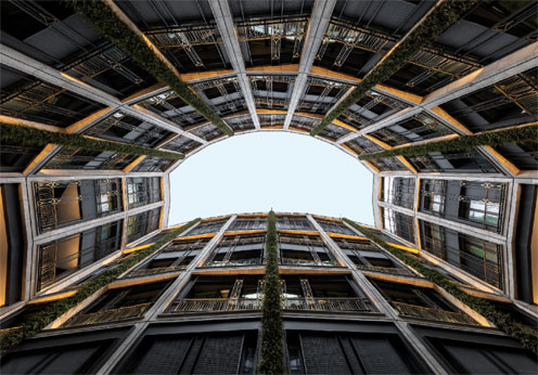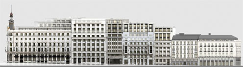 Las nuevas fachadas, situadas retranqueadas sobre las fachadas históricas, que son las protagonistas, las acompañan en un segundo plano, como un telón de fondo. Muestran el equilibrio entre mantener el orden individual, independiente, de cada uno de los edificios, dando continuidad al orden vertical de cada fachada, y mostrar que se trata de una intervención única y unitaria, mediante el uso de los mismos materiales y sistema constructivo para toda la intervención. Un ejemplo de convivencia entre lo clásico y lo contemporáneo. Un gran patio central dota de luz a las habitaciones y crea un espacio atemporal, alejado del bullicio y del ruido del entorno. Su fachada se desarrolla en varios planos que van realizando pequeños giros, como si de un caleidoscopio se tratara: el plano del cerramiento y el plano de la cerrajería, dotan de riqueza y profundidad a la fachada y permitien una mayor privacidad a las habitaciones.