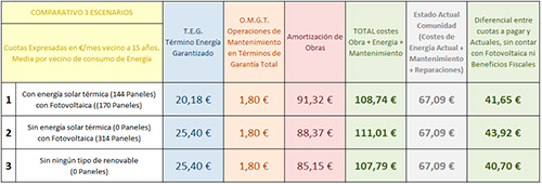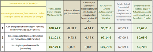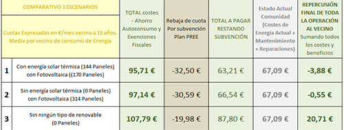 Si no contamos con las exenciones fiscales, subvenciones, ni con la energía proveniente de los paneles híbridos-fotovoltaicos instalados, el resultado es que los vecinos tendrán que pagar de media, un sobrecoste bastante similar, se compensa más o menos ahorro energético por termo-solar, (unos 238.000 kWh/año) con el aumento del presupuesto por implementarla.