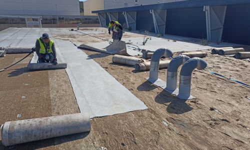 Con el fin de proteger la cubierta de los rayos UV y evitar caleo, el sistema constructivo puso su broche final con la poliurea alumínica AISMAR ECO-COAT que, además, actuará como protector reflexivo. ECO-COAT está especialmente diseñada para la impermeabilización de sistemas de hormigón, tableros puente y aljibes de agua no potable. Cuenta con marcado CE, clasificación al fuego UL 790, clase A (según ASTM 108) y categoría W3 de vida útil extendida de hasta 25 años.