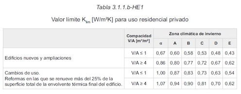 1. Espesores de aislamiento térmico en Obra nueva y rehabilitaciones de más del 25% de la envolvente (Residencial privado): los espesores mínimos de aislamiento a utilizar vendrán determinados por el coeficiente global de transmisión de calor a través de la envolvente térmica (K) del edificio, que no superarán el valor límite (Klim) obtenido de la tabla 3.1.1.b-HE1: