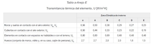 Este valor del coeficiente global de transmisión de calor es el que el proyectista deberá de justificar y dependerá de multitud de parámetros (calidad y espesor de aislamiento, el porcentaje de huecos y la calidad de los mismos, puentes térmicos, etc.) pero podemos hacer uso de la tabla a-Anejo E que aporta valores orientativos de los parámetros característicos de la envolvente térmica que pueden resultar útiles para el pre dimensionado de soluciones constructivas de edificios de uso residencial privado. Los valores orientativos de dicha tabla son los siguientes: