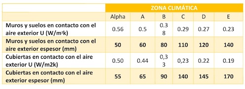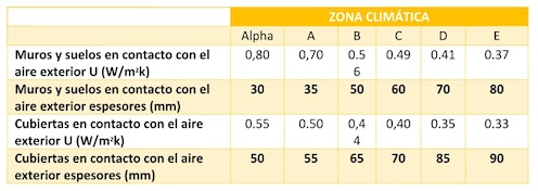Teniendo en cuenta la anterior tabla, los espesores orientativos de aislamiento térmico a utilizar para una lana mineral de conductividad térmica 0,035 W/mK serían los siguientes: