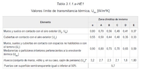 2. Espesores de aislamiento térmico en rehabilitaciones de menos del 25% de la envolvente (Residencial privado): en el caso de las reformas en el que se renueve menos del 25% de la superficie total de la envolvente térmica del edificio, la transmitancia térmica (U) de cada elemento perteneciente a la envolvente térmica que se sustituya, incorpore o se modifique sustancialmente, no superará el valor límite (Ulim) de la tabla 3.1.1.a-HE1: