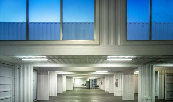 La pintura blanca exterior permite la reflexión de hasta el 90 por ciento de la radiación solar y su especial composición con microesferas cerámicas evita su excesivo calentamiento. La volumetría exterior generada dialoga con el entorno. La planta inferior, más masiva, está deprimida con respecto a la cota de la ciudad. Los lucernarios separados permiten observar ambas riberas a través de ellos. De cerca, muestran claramente su naturaleza de contenedor marítimo.