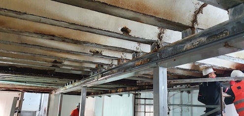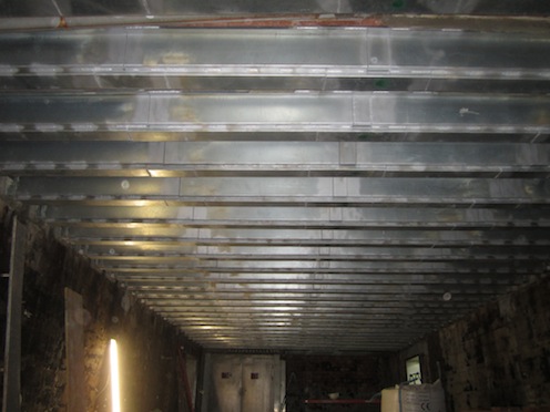 Detallando aún más, este forjado es un techo de una cámara frigorífica que, por temas de sobrecargas, tenía un pórtico metálico en el centro para reducir la luz real de las viguetas.