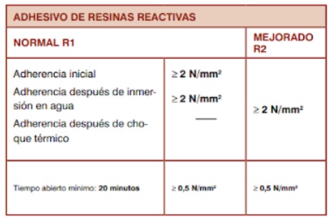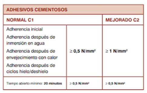 • Adherencia después de choque térmico: Incluye cuatro ciclos de inmersión en agua a 23 º y 100 ºC. Los resultados del ensayo de adherencia bajo las diferentes modalidades de acondicionamiento de las probetas, junto a un tiempo abierto mínimo de 20 minutos (a excepción de los cementosos de fraguado rápido para los que solo se exigen 10 minutos).