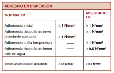 • Adherencia después de envejecimiento con calor: Consiste en mantener las probetas 14 días en condiciones de laboratorio y 14 días a 70 ºC, y evalúa el comportamiento de la resina a esa temperatura. La norma contempla además las características adicionales de los adhesivos en dispersión D–2