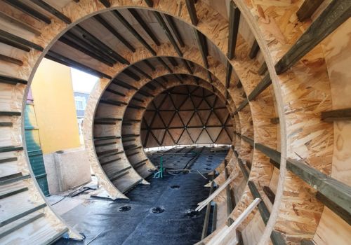 La piel exterior se resuelve mediante un sistema de fachada ventilada con paneles de composite de aluminio. Este sistema permite obtener un acabado exterior muy duradero y con una imagen de edificio contemporáneo. Energéticamente, la fachada ventilada aporta un mejor comportamiento térmico, sobre todo en verano. La impermeabilización se realizó con una pintura de base mineral y ecológica de color rojizo, para que contrastara con el metalizado de la piel exterior a través de sus juntas, destacando así la geometría geodésica de la cúpula.