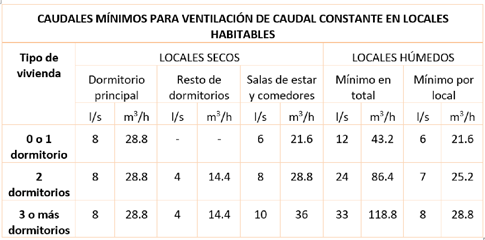 Se ha diseñado el sistema de ventilación siguiendo las directrices de la normativa vigente: el Documento Básico de Salubridad HS 3, referente a la Calidad el Aire Interior, del Código Técnico de la Edificación (CTE) . Esta norma establece, como requisito básico, que el aire debe circular desde los locales secos a los locales húmedos y que se debe realizar una renovación de aire en el interior de las viviendas en función del tamaño de las mismas y del tipo de local (seco o húmedo). Los caudales mínimos de ventilación para los locales habitables establecidos por el CTE aparecen en la siguiente tabla: