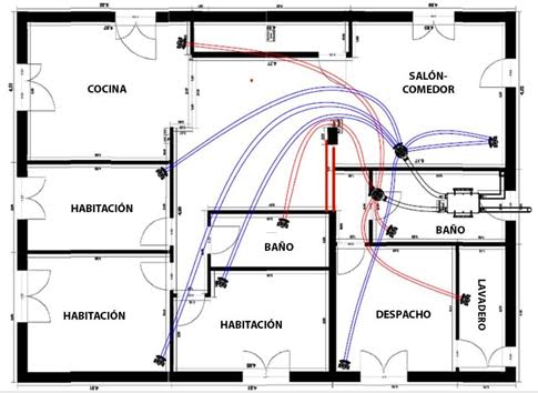El plano de instalación de la solución completa se comparte a continuación, con los conductos de aportación en color azul y los de extracción en color rojo.