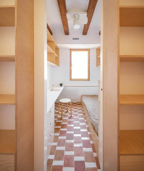 Dentro de este perímetro (techo, suelo, fachadas) se construye una nueva "caja" de madera que por "fuera" engloba cocina, estanterías y almacenaje. En su interior se "encierran" los dormitorios de las hijas adolescentes.