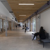 La misma idea entre zonas más sofisticadas en cuanto a su acabado y otras más “brutas”, más crudas, podemos encontrar en los interiores. Suelos, techos y paramentos verticales interiores responden a la misma idea de seleccionar la intensidad con la que los espacios se presentan más o menos acabados. Esta selección de intensidad o de carga de diseño de algunas áreas atiende a las nuevas necesidades pedagógicas, cambiantes en el tiempo.