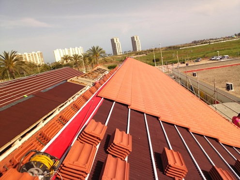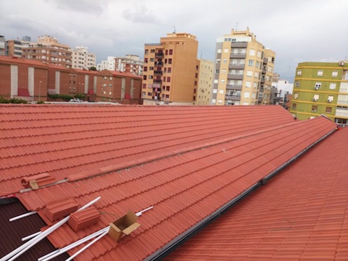 Por último, se procede a la instalación de la cobertura de la cubierta; en este caso, una teja cerámica plana alicantina de La Escandella. Las tejas se instalan apoyándose directamente sobre los listones de PVC Onduline y su sujeción a estos se consigue tanto por el propio tacón de la teja como por la fijación con masilla adhesiva para el pegado de tejas que tiene la elasticidad y resistencia adecuada para este uso.