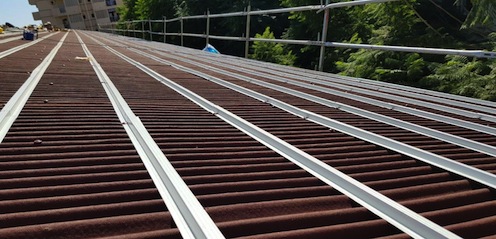 Una vez fijadas perimetralmente las placas a los paneles aislantes, se procede a replantear los perfiles metálicos bajo teja Onduline, que proporcionan una sujeción ligera, inoxidable y duradera para la teja, en este caso de hormigón.