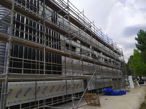 Para homogeneizar la imagen exterior de los edificios 01 objeto de la adecuación y 02 de nueva construcción, el revestimiento continuo aplicado sobre las placas Glasroc®X con morteros Webertene Advance XS, igualó en color y texturas las juntas entre paños en sendas fachadas.