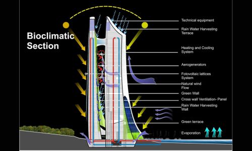 Vertical City es uno de los proyectos emblemáticos que aplican este sistema. Se trata de un edificio inteligente y “vivo” de más de 600 metros de altura para Arabia Saudí. Esta estructura laminar bioclimática controla el sol y optimiza la energía, formando la piel del edificio. El sistema interactúa entre el interior y el exterior con el entorno para proporcionar el mayor confort energético. Inspirado en las formas orgánicas de la naturaleza, se ha diseñado a través de estrategias de integración con su entorno, utilizando Corian® Solid Surface para la fachada.
