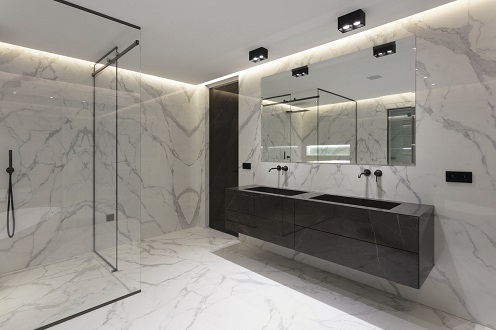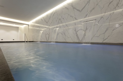 En la piscina cubierta, luces de neón atraviesan el techo en una sucesión de líneas tornasoladas que enfatizan, por contraste, las sinuosas de las pequeñas y sugestivas cascadas de agua de alimentación además de las casi reflectantes de las paredes revestidas con Calacatta Light: un efecto mármol que habla de naturaleza y eternidad. Por otra parte, refinadas secuencias de claroscuro y líneas purísimas son las elecciones estilísticas privilegiadas para los servicios de los seis dormitorios, donde el color intenso del Pietra Grey lustrado para los lavabos escuadrados contrasta armónicamente con el blanco jaspeado de Calacatta Light lustrado, colocado para el pavimento, y en versión mancha abierta «book-matched» (placas especulares), para el revestimiento.